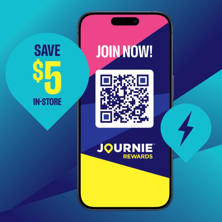 *The first paid EV charge in the Journie App must be greater than 5 minutes to qualify for this offer. The additional $5 in-store reward based on every 100 kWh charged in the App is calculated cumulatively starting with the first paid EV transaction. Get $5 off at any participating location. A minimum spend of $5 is required. Limited time offer.