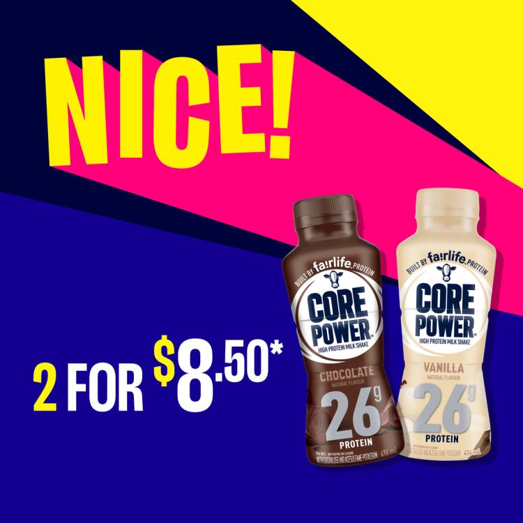 Power up your day with our special offer: 2 Core Power protein shakes for just $8.50! Available in a variety of flavours, Core Power provides the fuel you need to stay energized.